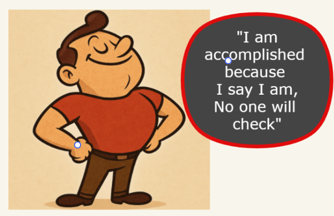 1 – STATEMENTS OF ACCOMPLISHMENT & GRANDIOSITY WITH NO EVIDENCE TO SUPPORT THEM. This is the person who consistently boasts their knowledge, superiority, accomplishments & status, however, there is a lack of supportive evidence.